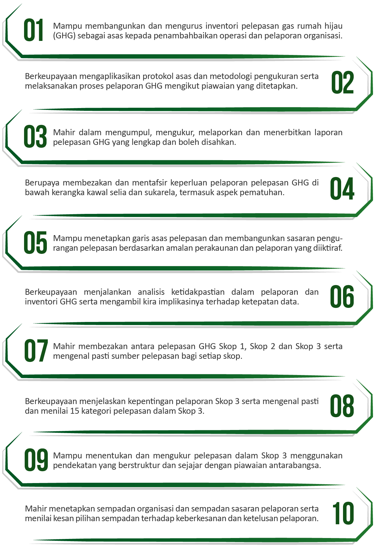 • Memahami kepentingan inventori pelepasan gas rumah hijau (GHG) serta peranannya dalam penambahbaikan operasi dan pelaporan organisasi.
